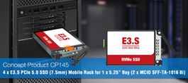Das CP145 unterstützt bis zu vier PCIe 5.0 NVMe E3.S Laufwerke in einem einzigen 5,25"-Geräteschacht und erweitert damit das Speicherpotenzial Ihres Systems ohne Einbußen bei Geschwindigkeit oder Leistung.