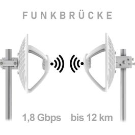 Unsere Funkbrücke Maxi ermöglicht stabile Verbindungen über bis zu 12 km mit einem Datendurchsatz von 1,8 Gbps. Das Modell ist perfekt für weit entfernte Gebäude, die zuverlässige Internetverbindungen benötigen, etwa für Videoüberwachung oder Daten-Backhaul. Die robuste Bauweise sorgt für Witterungsbeständigkeit, während das kompakte Design eine einfache Installation ermöglicht.