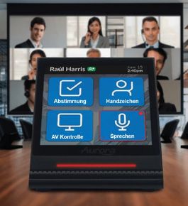 Die „Handzeichen"-Taste, lässt die hintere LED blinken und kann den anderen Touchscreens mitteilen, wer als nächster in der Warteschlange zu Wort kommen möchte. Es besteht über die „Abstimmmungstaste“ die Möglichkeit unmittelbar abzustimmen, die Ergebnisse zu speichern und sie später abzurufen.