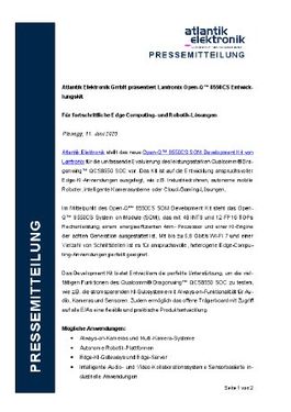 Im Mittelpunkt des Open-Q™ 8550CS SOM Development Kit steht das Open-Q™ 8550CS System on Module (SOM), das mit 48 INT8 und 12 FP16 TOPs Rechenleistung, einem energieeffizienten 4nm- Prozessor und einer KI-Engine der achten Generation ausgestattet ist. Mit bis zu 5,8 Gbit/s Wi-Fi 7 und einer Vielzahl von Schnittstellen ist es für anspruchsvolle, heterogene Edge-Computing-Anwendungen perfekt geeignet.