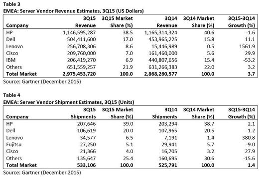 In der EMEA-Region wurden insgesamt 533 Millionen Server-Einheiten verkauft und ein Umsatz von drei Milliarden Dollar erwirtschaftet. Dies bedeutet ein Wachstum von 1,4 und 3,7 Prozent im dritten Quartal 2015.