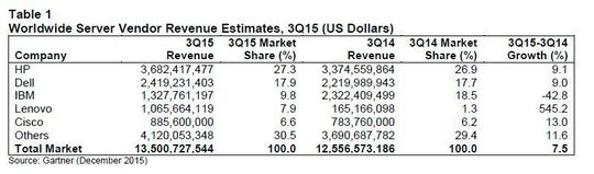 Insgesamt steigerten im dritten Quartal 2015 alle Top-5-Verkäufer - HPE, Dell, Lenovo, Huawei und Inspur - ihre weltweiten Server-Lieferungen. Lenovo verzeichnet hierbei wegen der Übernahme der IBM-x86-Server das größte Wachstum, mit einem Plus von 183,2 Prozent.